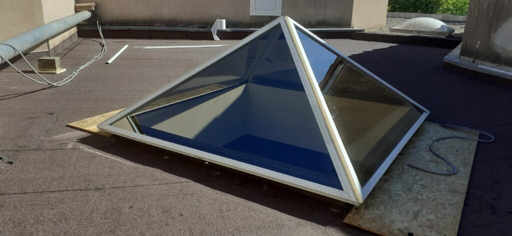 Le précadre – cet encadrement posé sur la toiture pour recevoir le dôme – assure une interface plane et stable entre notre menuiserie et la membrane d’étanchéité. Pas de bricolage ici : nous assemblons ensuite la structure pyramidale avec des profilés en PVC ou aluminium laqué blanc, choisis pour leur légèreté et leur excellente résistance aux UV.